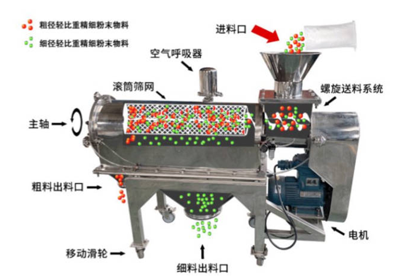 氣流篩分機:主體為立式密閉圓筒篩箱,中心裝有高速旋轉(zhuǎn)的轉(zhuǎn)子(風輪)。篩網(wǎng)呈圓筒狀嵌于箱體內(nèi)壁。工作時,風機產(chǎn)生的氣流攜帶物料,在轉(zhuǎn)子作用下使細粉穿透篩網(wǎng),粗粉被分離。通常配有旋風分離器實現(xiàn)氣固分離。