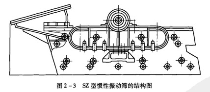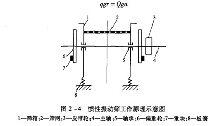圖2-3和圖2-4分別是sZ型慣性振動篩的外形圖和工作原理示意圖。從圖中可以看出,這種篩子有8個主要組成部分,其中篩網固定在篩箱上,篩箱安裝在兩個橢圓形板簧上,板繭底座固定在基礎上,偏重輪和皮帶輪安裝在主軸上,重塊安裝在偏重輪上。改變重塊在偏重輪上的位置,可以得到不同的離心慣性力,以此來調節篩子的振幅。主軸通過兩個滾動軸承固定在篩箱上。篩箱一般呈15°―25°傾斜安裝,以促進物料在篩面上向徘料端運動。